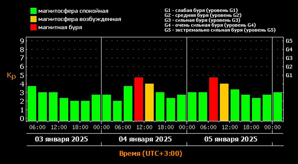 Предполагается, что первая магнитная буря произойдет в середине дня 4 января, а вторая буря случится в первой половине дня 5 января. Пока сложно сказать, будут ли магнитные бури 6 января, но такая вероятность существует.