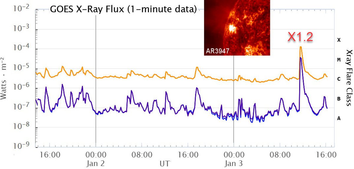 Дело в том, что Солнце поворачивается к Земле активным пятном AR3947, 3 января выдавшим вспышку максимального класса X1.2. Во время вспышки не случилось масштабного коронального выброса массы, то есть она не приведет к магнитной буре, но AR3947 может сгенерировать и другие вспышки.