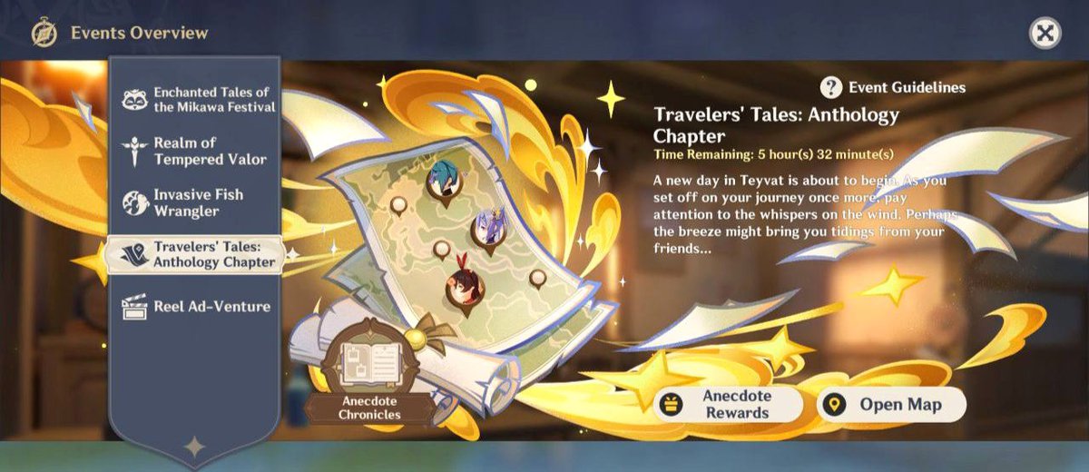 В обновлении 5.4 разработчики Genshin Impact введут новый эвент, связанный с персонажами игры, следует из бета-версии патча. Событие будет называться Traveler's Tales: Anthology Chapter.