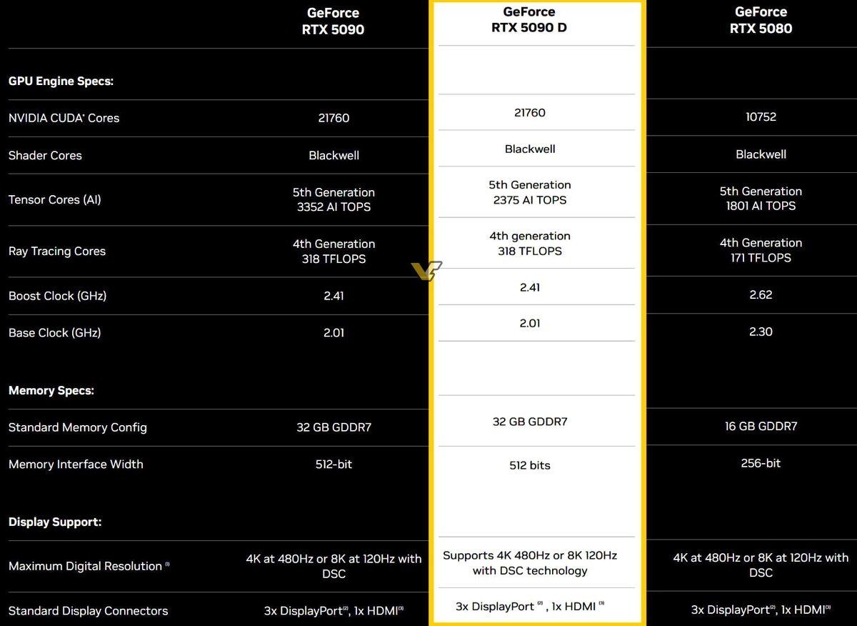 Выпуская GeForce RTX 4090D, инженеры Nvidia были вынуждены снизить производительность в целом — и при работе с играми (это не волнует власти США), и при работе с ИИ (а вот это волнует). При создании GeForce RTX 5090 в Nvidia, видимо, заранее спроектировали урезанный чип для китайских карт.