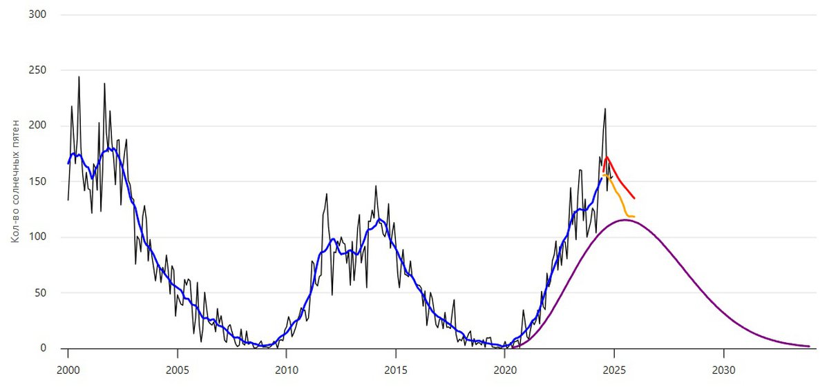 Скорее всего, пик нынешнего солнечного цикла будет пройден до конца 2025 года. Затем активность звезды станет постепенно снижаться, достигнув минимума ближе к середине 2030-х годов. Потом Солнце снова начнет наращивать активность.