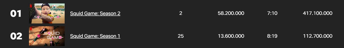 Примечательно, что выход второго сезона «Игры в кальмара» увеличил количество зрителей и у первого сезона. Сейчас сезоны занимают первое и второе места в топе самых просматриваемых проектов Netflix за неделю.