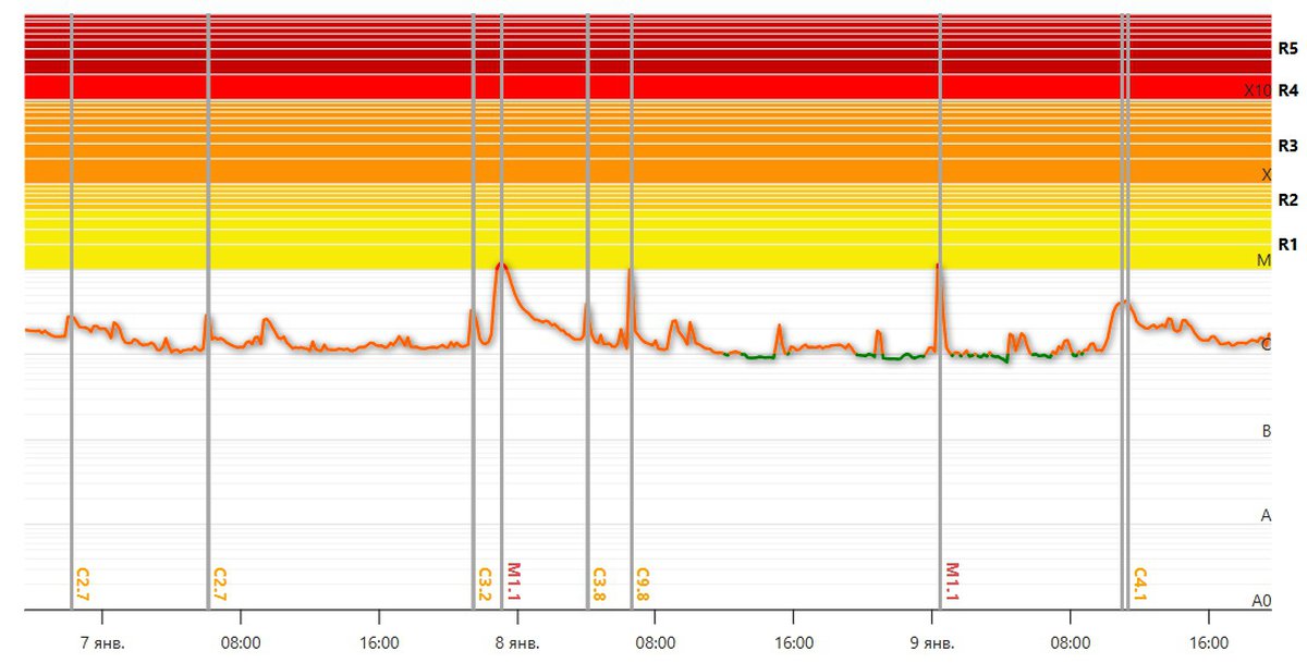 Начиная с 6 января активность звезды сильно снизилась. Если в предыдущие дни на Солнце регулярно происходили вспышки максимального класса X, то сейчас самые мощные из вспышек едва-едва дотягивают до класса M.
