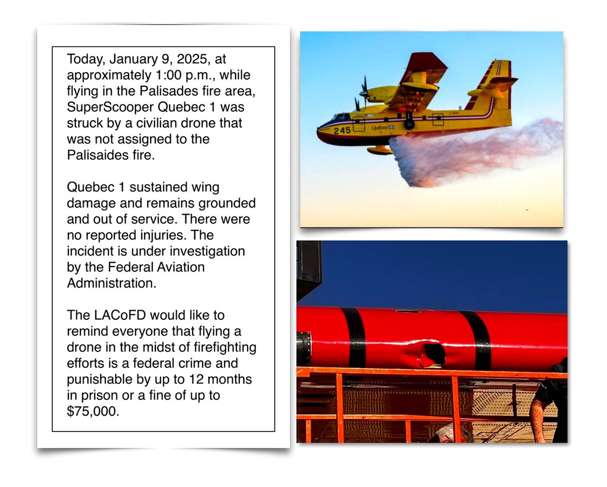 После инцидента с CL-415 Super Scooper ФБР пообещало активнее пресекать полеты дронов в зоне, где работают пожарные. Хотя в районе Лос-Анджелеса ввели ограничения на полеты беспилотников, обычного запрета оказалось недостаточно.