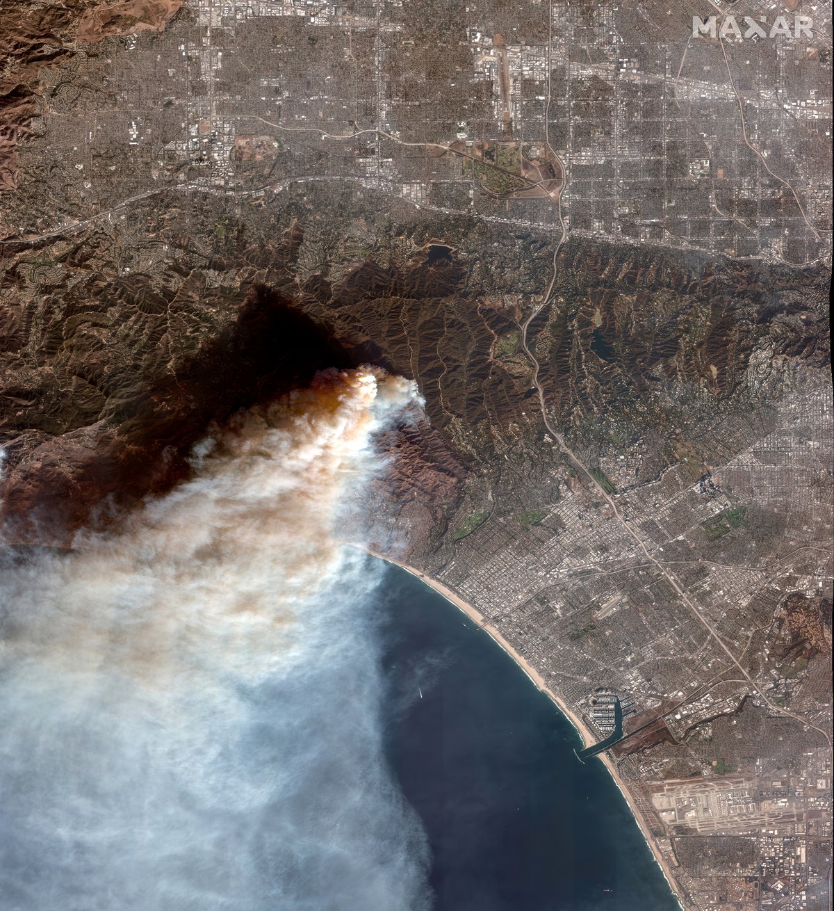 Сами пожары все еще не удалось полностью локализовать, но получилось остановить распространение огня в сторону Лос-Анджелеса. Оценить масштабы бедствия можно на спутниковом снимке компании Maxar.