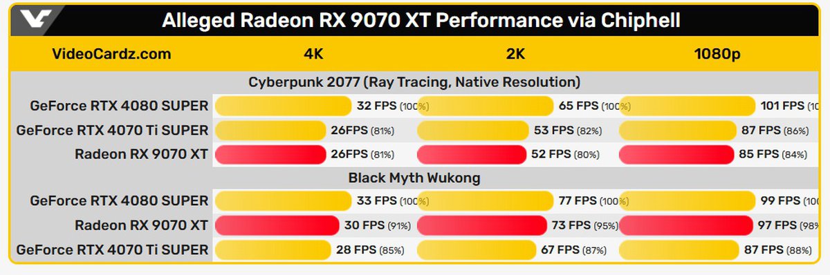Утечка: Radeon RX 9070 XT примерно равна GeForce RTX 4070 Ti Super в Cyberpunk 2077 и Black Myth Wukong