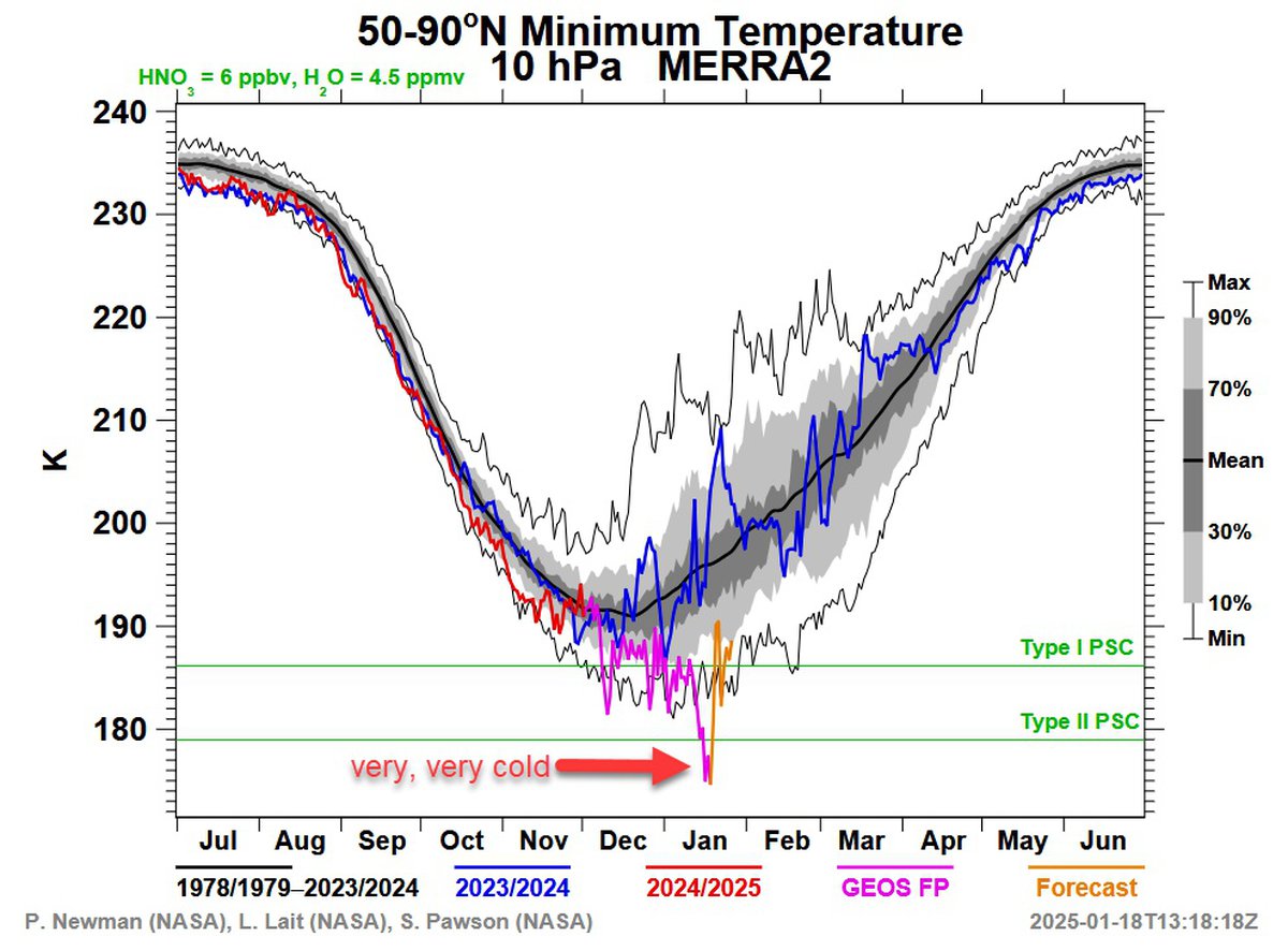 В стратосфере над полярным кругом сейчас очень холодно: согласно подсчетам NASA, в середине января температура в стратосфере упала ниже -90 градусов Цельсия. Это уровень, не фиксировавшийся как минимум с 1978 года.