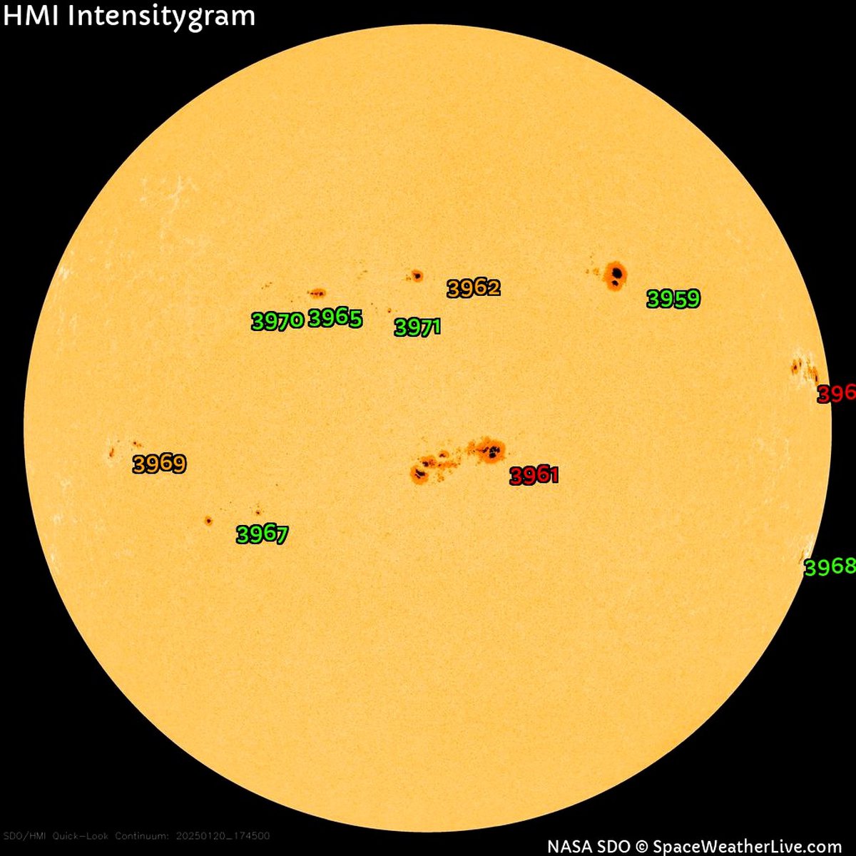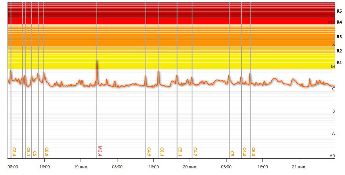Последняя вспышка класса M произошла больше двух дней назад — рано утром 19 января. С тех пор на Солнце случаются лишь очень слабые вспышки, не оказывающие никакого воздействия на Землю.