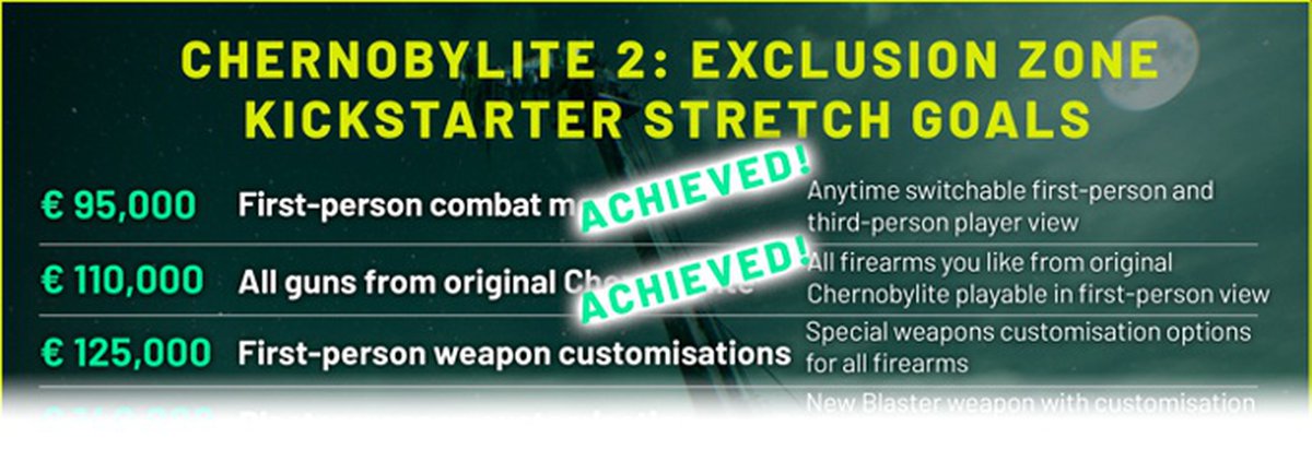 Это значит, что Chernobylite 2 вот-вот выполнит вторую цель кампании: она активируется, когда будет собрано 125 тысяч евро. Бонусы кампании выглядят так: