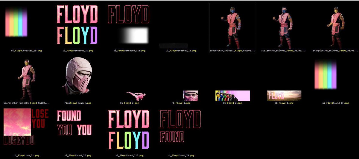 Судя по идентификаторам и файлам, найденным датамайнерами, речь идет о скинах для Скорпиона и Саб-Зиро. Кроме того, в файлах нашлось изображение головы совершенно нового персонажа, называющегося именно Pink Floyd.