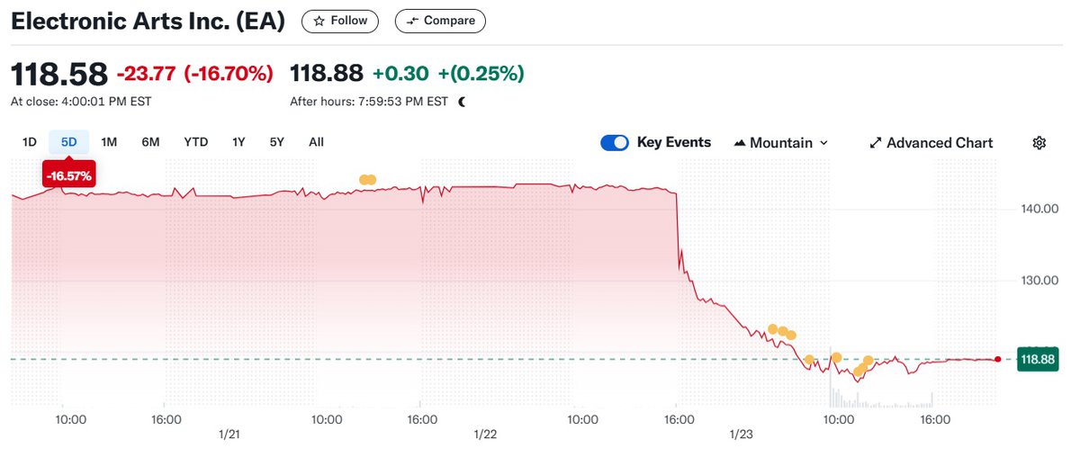 Акции Electronic Arts упали на 16.7% по итогам торгов 22-23 января. Таким образом рынок отреагировал на сообщение компании о провальных продажах Dragon Age The Veilguard и неудовлетворительных результатах EA SPORTS FC 25.