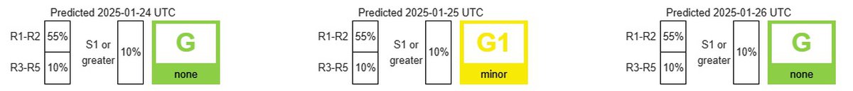 Наивысшая вероятность бури присвоена 25 января (35%), для 24 января (30%) и 26 января (20%) показатели существенно ниже. Даже если буря и произойдет, то ее сила не превысит минимальный класс G1, а пик придется на 25 января; в остальные дни магнитосфера будет еще спокойнее.