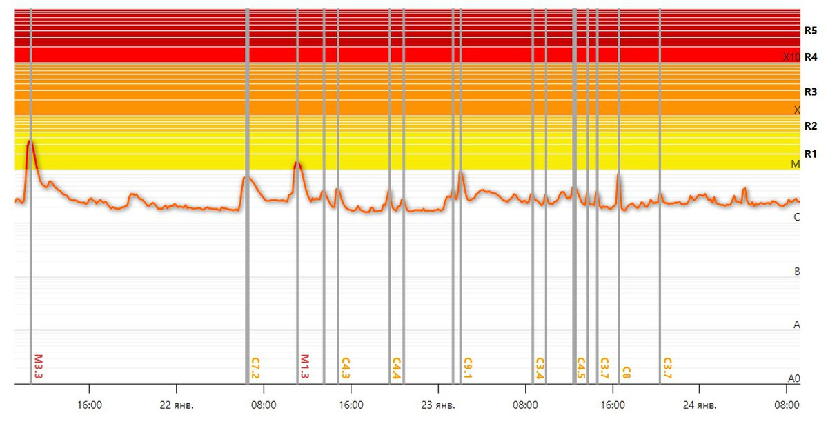 Как минимум до 27 января мощных магнитных бурь, видимо, не будет. Солнце, слегка активизировавшееся несколько дней назад, снова ведет себя достаточно спокойно: за последние сутки не было ни одной вспышки хотя бы предмаксимального класса M.