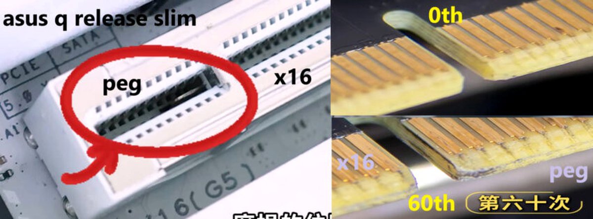 Слот на материнской плате закусывает контактную площадку видеокарты и довольно быстро начинает ее обдирать. В Uniko's Hardware провели эксперимент и вынули карту из слота 60 раз; в результате ее контакты стали выглядеть довольно печально.