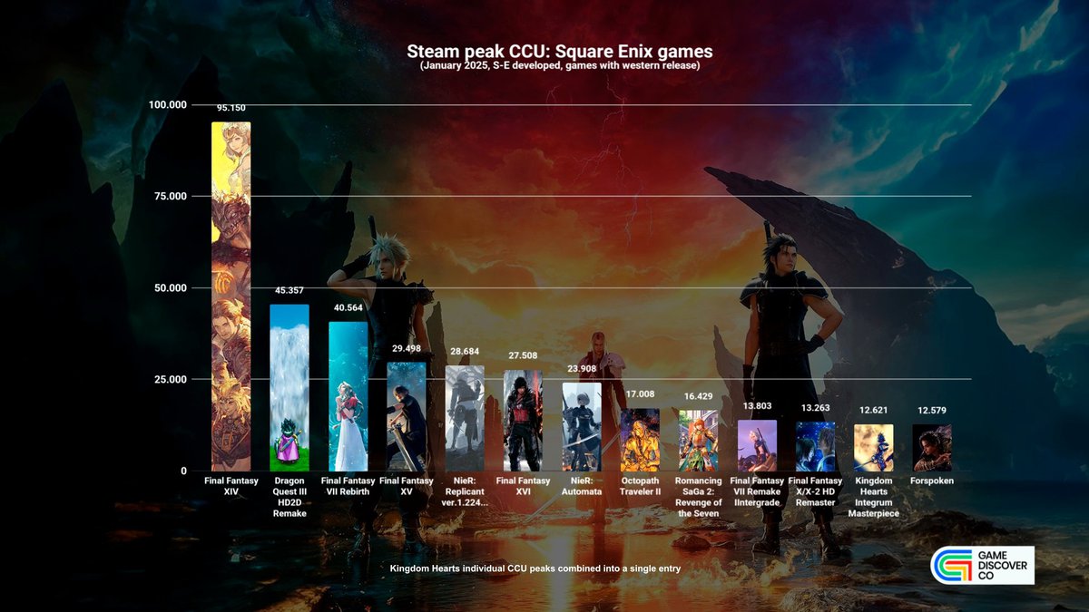 Среди всех игр Square Enix, выходивших в Steam, у Final Fantasy VII Rebirth пока третье место по онлайну. Первая позиция все еще у Final Fantasy XIV, на второй строчке ремейк Dragon Quest III HD2D.