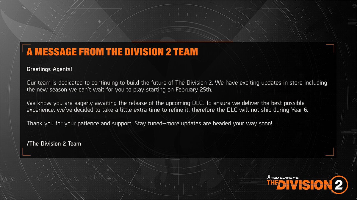Ubisoft на неопределенное время отложила выпуск следующего сюжетного дополнения к The Division 2. Дополнение должно было выйти до конца шестого года поддержки игры, нового релизного окна у него нет — аддон будут полировать.