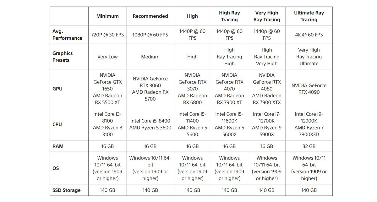 Spider-Man 2 все-таки выйдет на ПК по графику: за день до релиза игровое подразделение Sony раскрыло системные требования игры. Подготовлено сразу 6 конфигураций — игра поддерживает трассировку лучей.