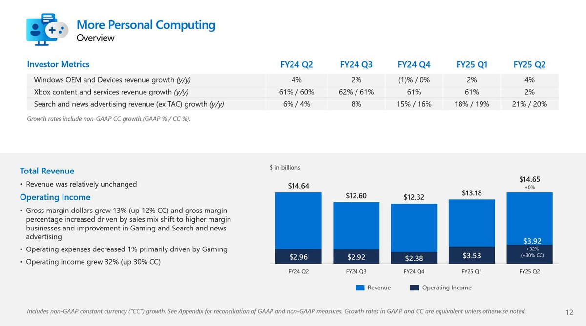 Корпорация Microsoft опубликовала отчет за второй квартал 2025 финансового года — у компании он закончился 31 декабря 2024 календарного года. Выручка выросла на 12%, до $69.2 миллиарда, чистая прибыль увеличилась на 10%, до $24.1 миллиарда.
