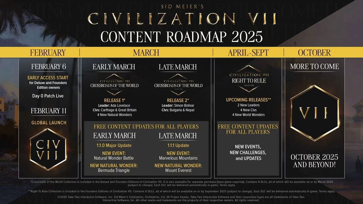 В промежутке с апреля по сентябрь разработчики добавят в Sid Meier’s Civilization 7 еще двух лидеров, четыре чуда света и четыре цивилизации — они появятся в платных DLC. Также будут бесплатные обновления с новыми событиями и испытаниями.