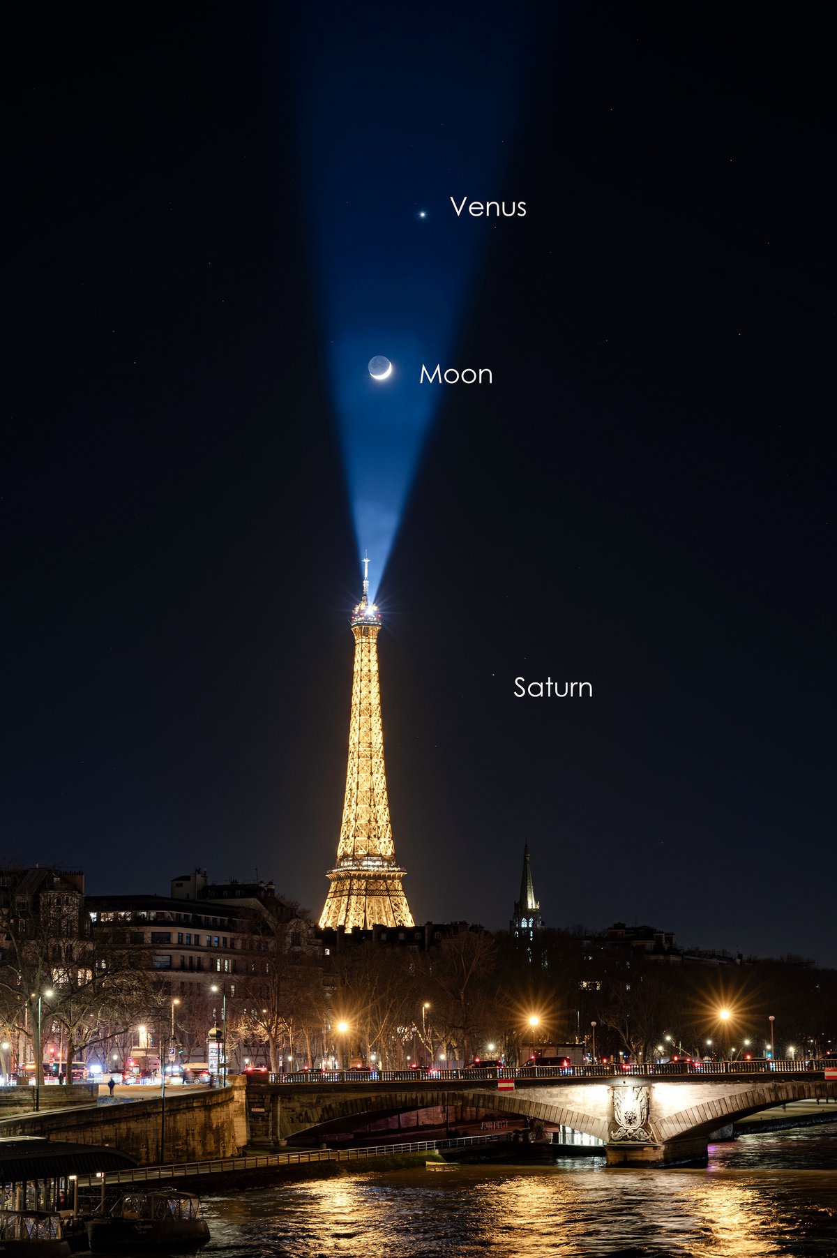 Если присмотреться, то окажется, что на фотографии есть и еще одно крупное небесное тело — Сатурн. К сожалению, планета не участвовала в соединении; Сатурн расположился правее Эйфелевой башни, почти ровно над шпилем одной из парижских церквей.