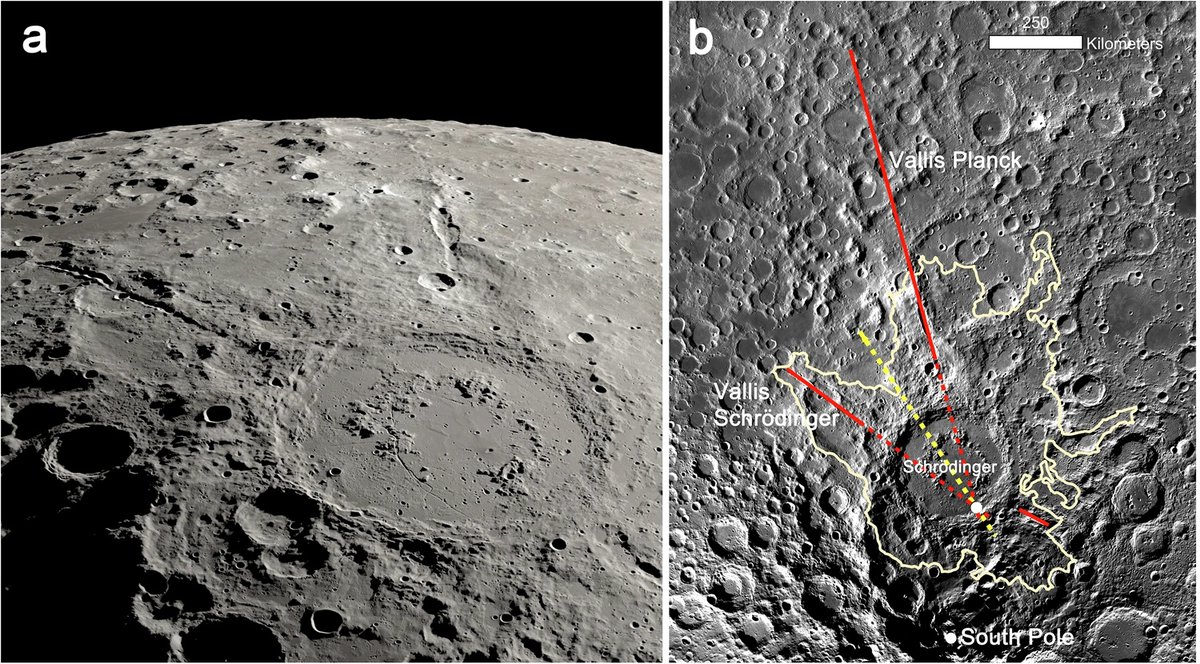 На обратной стороне Луны существуют две крупных долины — долина Шредингера и долина Планка, — каждая из которых протянулась почти на 300 километров и имеет больше 2 километров в глубину. Ученые считают, что долины появились очень быстро.
