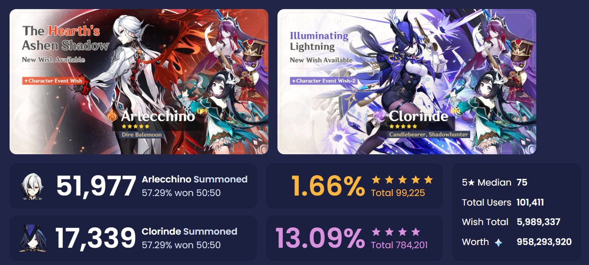 Во втором баннере патча были запущены рераны Арлекино и Клоринды. Согласно данным сервиса, разница в количестве полученных персонажей достигла почти трех раз в пользу Арлекино.