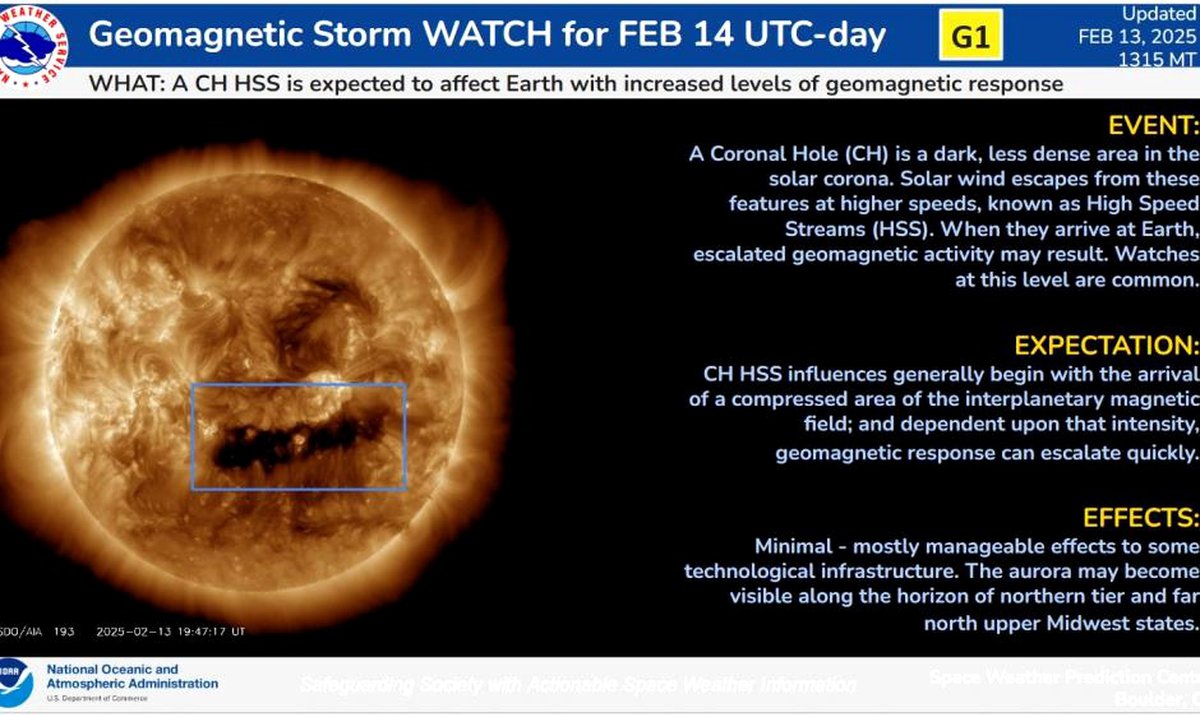 14 февраля до Земли все-таки добрался поток солнечного ветра из крупной корональной дыры в атмосфере Солнца. Ожидалось, что солнечный ветер приведет к короткой ночной магнитной буре, но поток оказался мощнее, чем предполагалось.