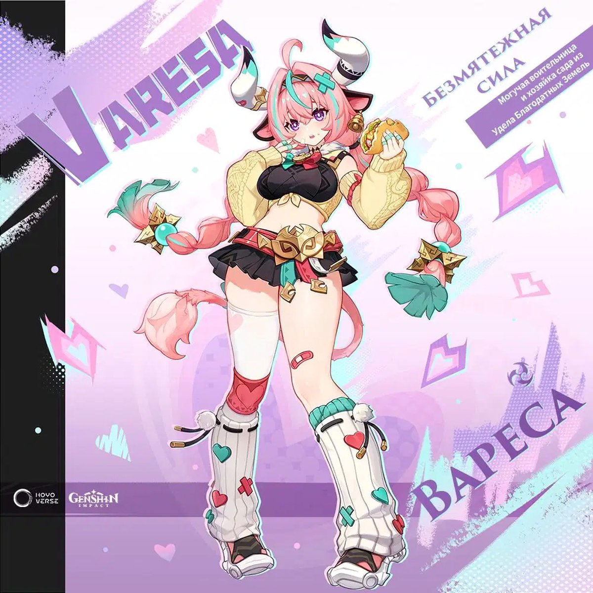 Вареса будет персонажем с 5 звездами редкости, у нее элемент электро и катализатор. С точки зрения лора Вареса — это представитель племени Удел Благодатных Земель, известного в Натлане силой и здоровьем своих членов.