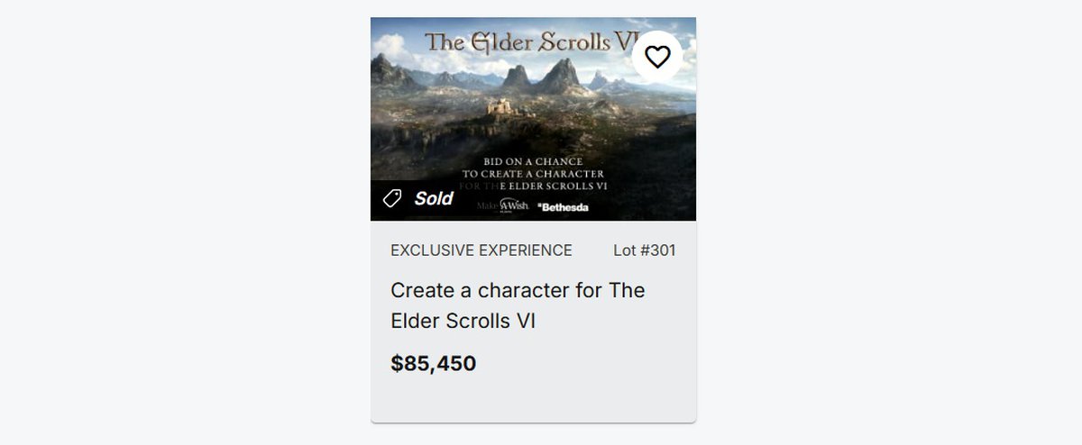 На благотворительном аукционе Make-A-Wish Mid-Atlantic завершились торги за лот, позволявший придумать NPC для The Elder Scrolls VI. Торги начались с $10000, финальная сумма оказалась в 8 раз выше: за лот заплатили $85450.