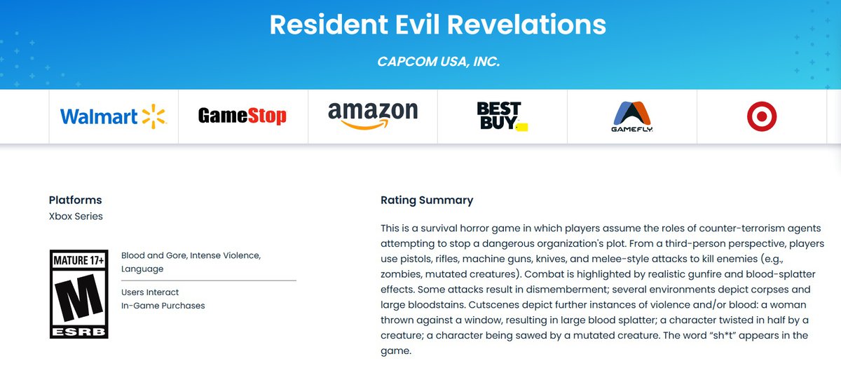 Компания Capcom продолжает получать новые возрастные рейтинги для старых игр серии Resident Evil. Рейтинговое агентство ESRB выдало возрастной рейтинг версии Resident Evil Revelations для Xbox Series: игра получила рейтинг 17+.