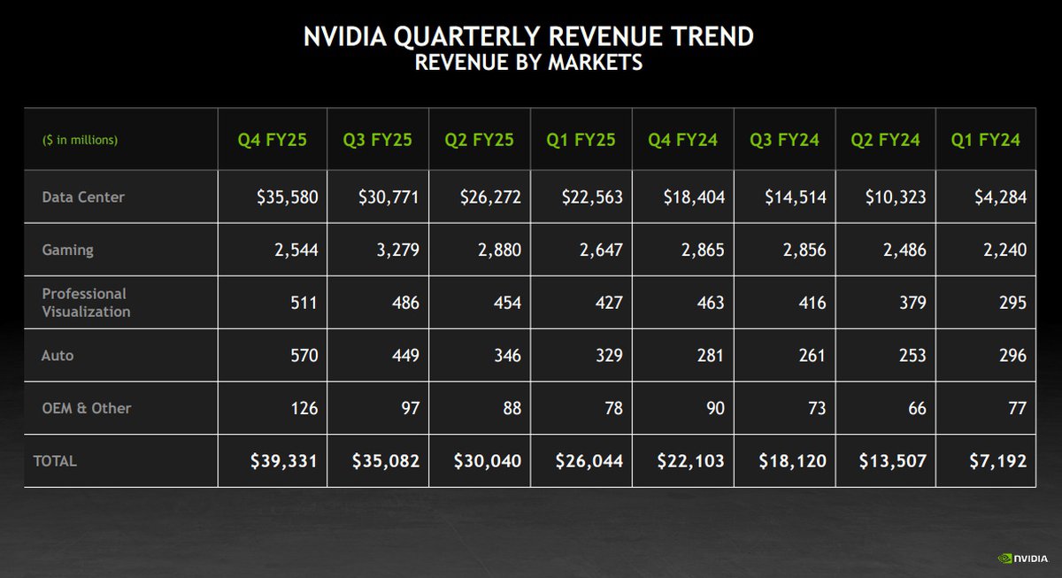 Наибольшую выручку за квартал и за год компании принесли ИИ-ускорители. В последнем квартале Nvidia заработала на них $35.5 миллиарда, это почти в 15 раз больше выручки компании, полученной от игровых видеокарт ($2.5 миллиарда).