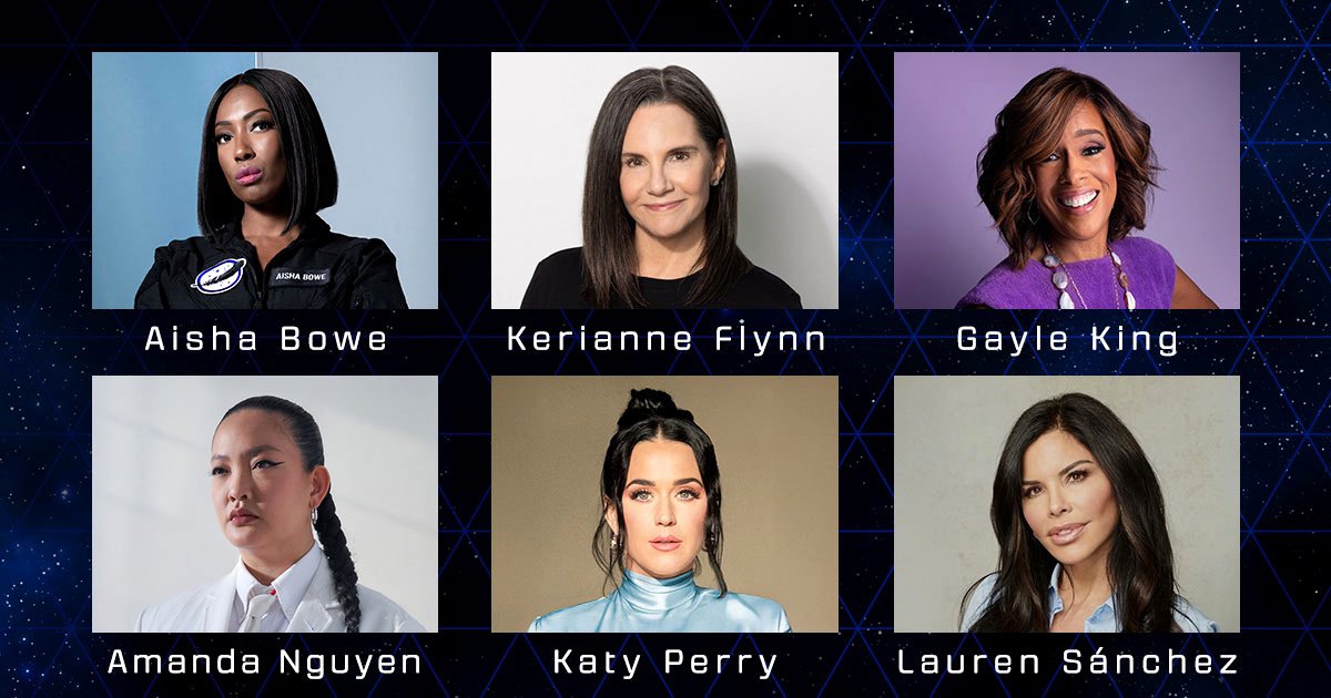 В космос полетят певица Кэти Перри, журналистка Гейл Кинг, писательница и пилот Лорен Санчес (это девушка владельца Blue Origin Джеффа Безоса) и режиссер Керианн Флинн.