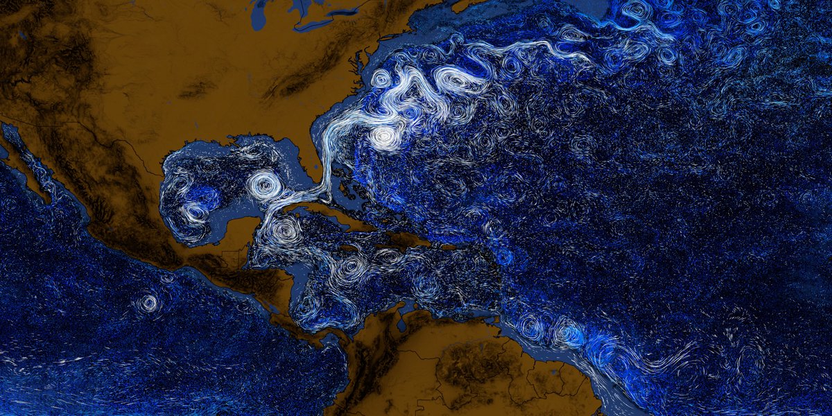 Кроме того, на визуализации хорошо видны западные пограничные течения: например, Гольфстрим у побережья Северной Америки. Здесь тоже не обошлось без того, что на визуализации выглядит как водоворот.