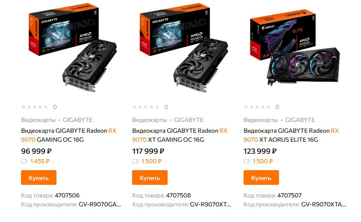 Площадка предлагает только карты от Gigabyte. Есть всего одна модель Radeon RX 9070 и две модели Radeon RX 9070 XT; первая карта обойдется в 97 тысяч рублей, вторая стоит минимум 118 тысяч рублей.