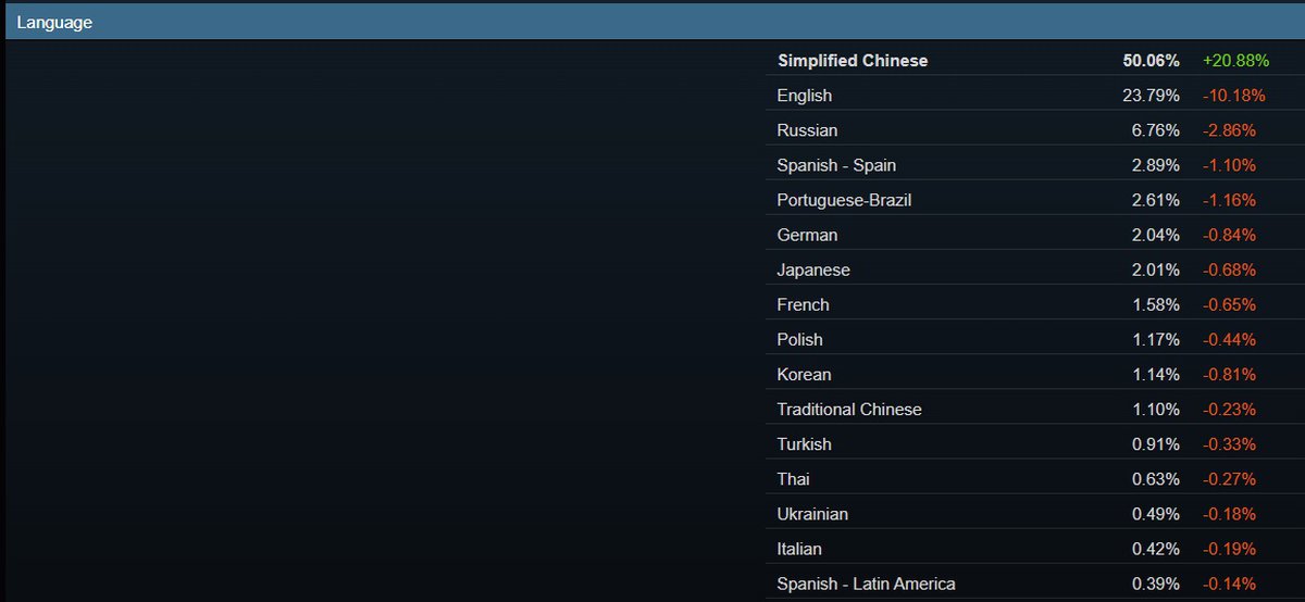 Английский язык, прежде занимавший первое место по числу пользователей, оказался на втором месте. Третье все еще занимает русский: теперь на его долю приходится 6.76% пользователей Steam.