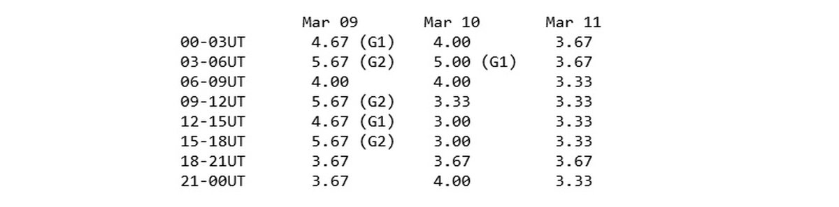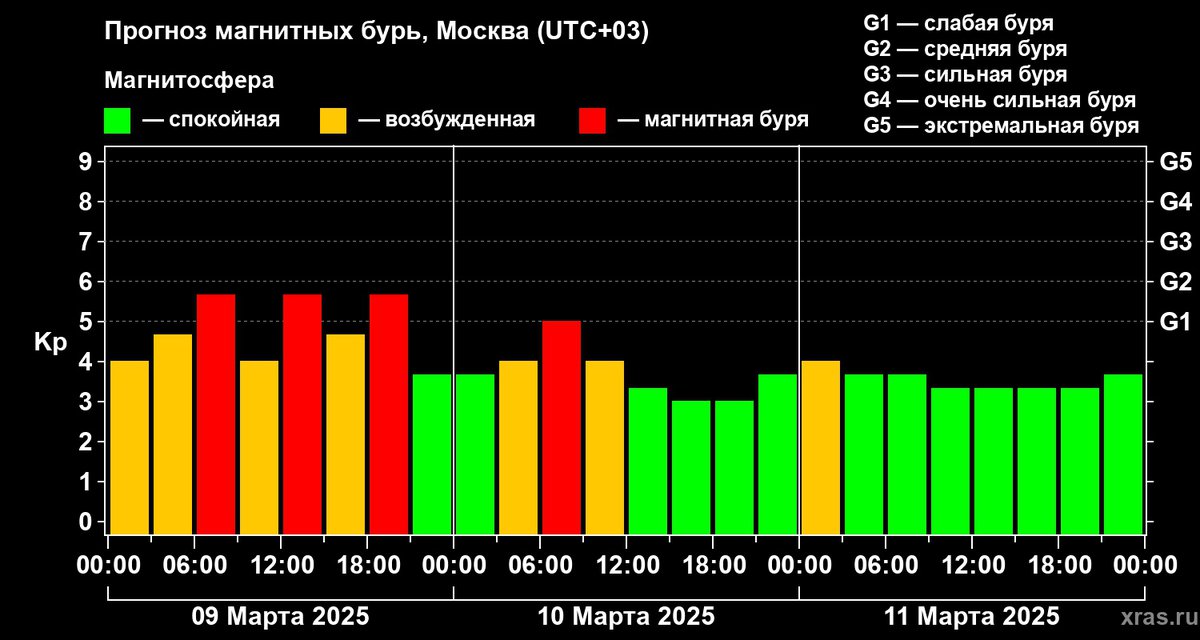 10 марта магнитосфера тоже будет более возбужденной, чем ожидалось ранее. Согласно последним прогнозам, затишье будет в районе полуночи, но затем примерно до полудня по Москве сила бури будет балансировать на уровне класса G1.