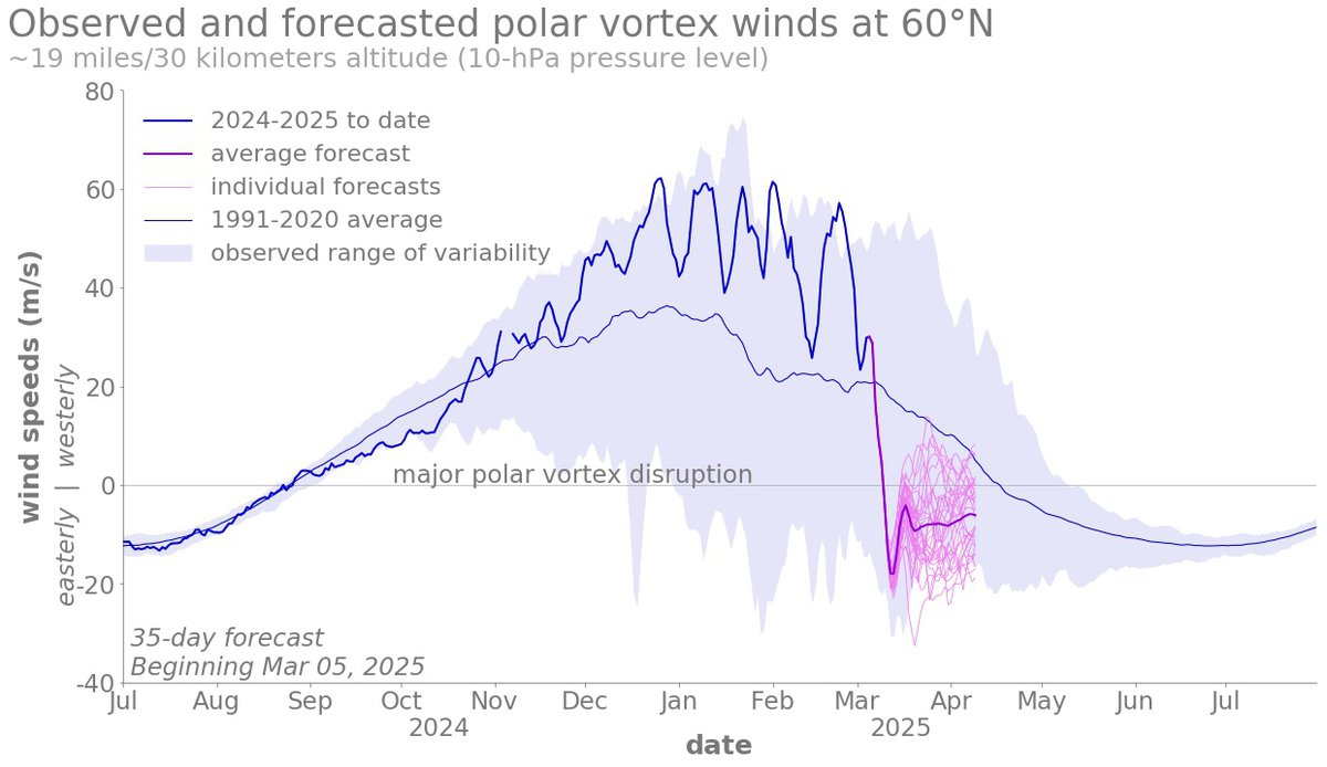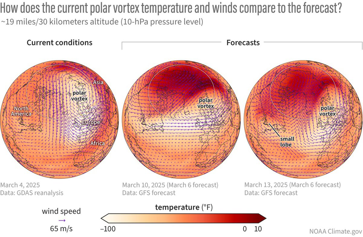 Иногда полярные вихри восстанавливаются, но на этот раз прогнозы указывают на окончательное разрушение вихря. Это означает, что холодный воздух из разрушенного вихря некоторое время будет дополнительно охлаждать некоторые области Канады, Европы и США.