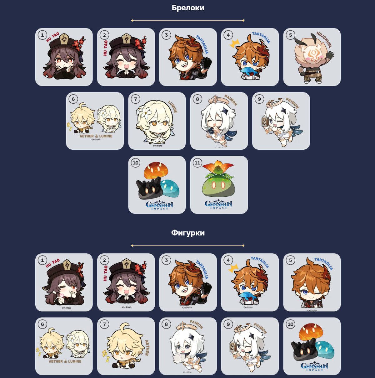 Игрокам предлагается поохотиться на 10 фигурок и 11 брелоков в стиле Genshin Impact. Правила получения мерчендайза достаточно просты: