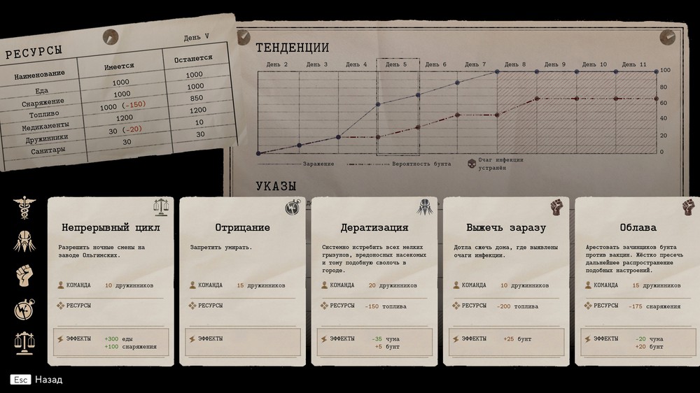 Например, можно приказать сжечь все заражённые чумой дома. Идея вроде бы здравая, но потребует 200 единиц топлива и поднимет уровень бунта. Или можно просто запретить людям умирать. Тоже хорошо и совершенно бесплатно.