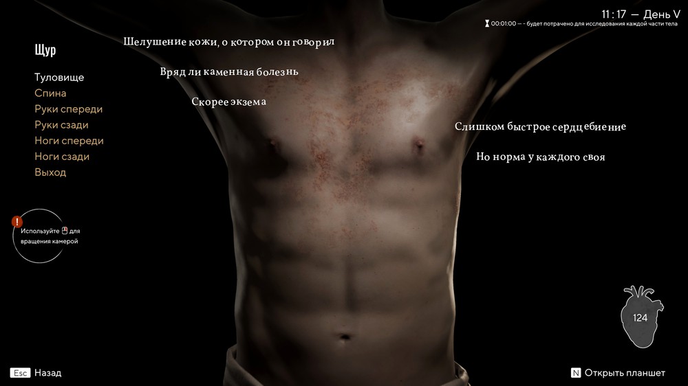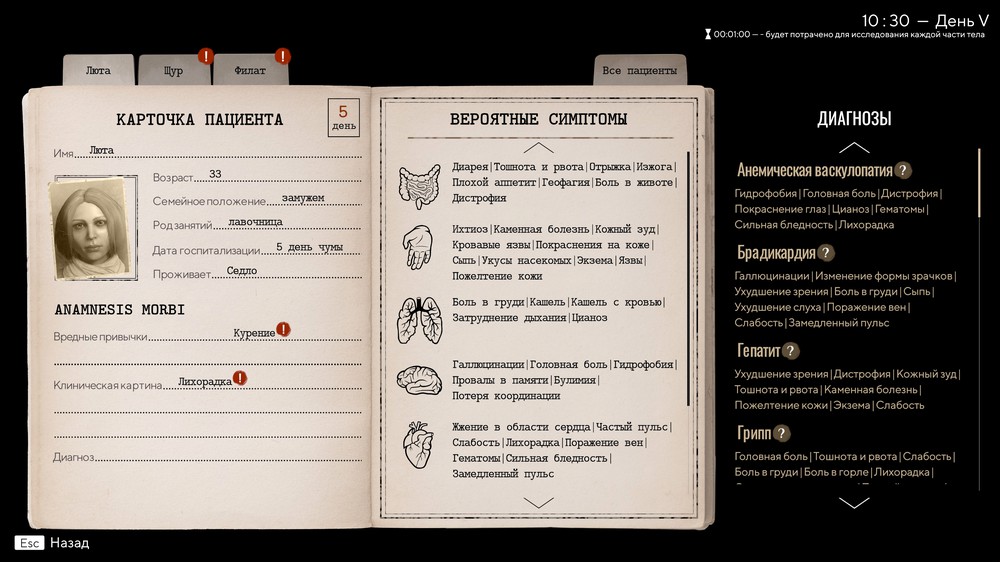 Симптомы, в свою очередь, трудно распознать. Пятно на ноге, которое по началу было принято за гематому или покраснение, может оказаться следом от краски, а покрасневшие глаза могут являться признаком простого недосыпания, а не анемической васкулопатии. Здесь и начинает работать вторая по важности игровая механика, позволяющая на самом деле почувствовать себя доктором.