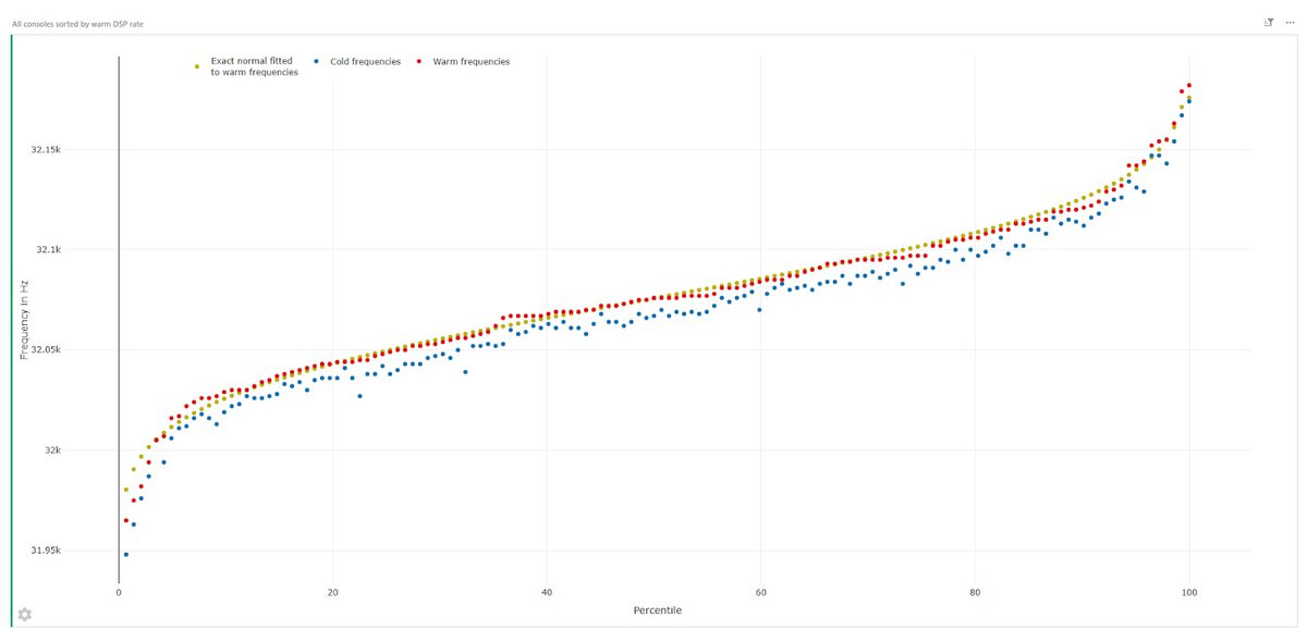 У самых быстрых из протестированных консолей сопроцессор работал на частоте 32182 Гц. Есть и устройства с частотами ниже 32000 Гц, но их гораздо меньше, чем тех, где частота работы сопроцессора выше заданной.