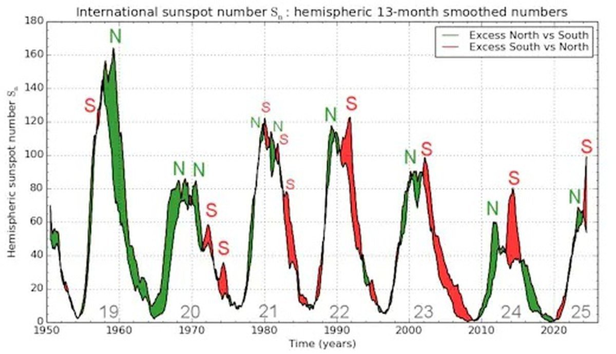 Если впереди действительно пик активности северного полушария, то есть вероятность, что мощных вспышек будет больше, чем на пике активности южного полушария. Обычно циклы солнечной активности устроены именно так: сперва проявляет активность одно полушарие, затем второе — причем сильнее.