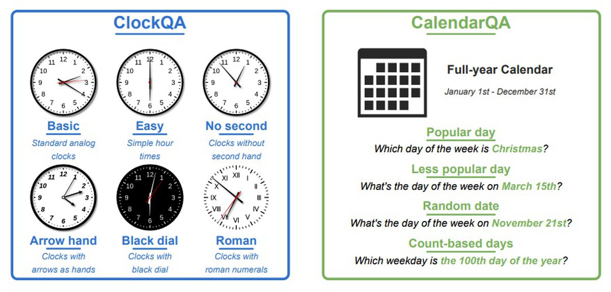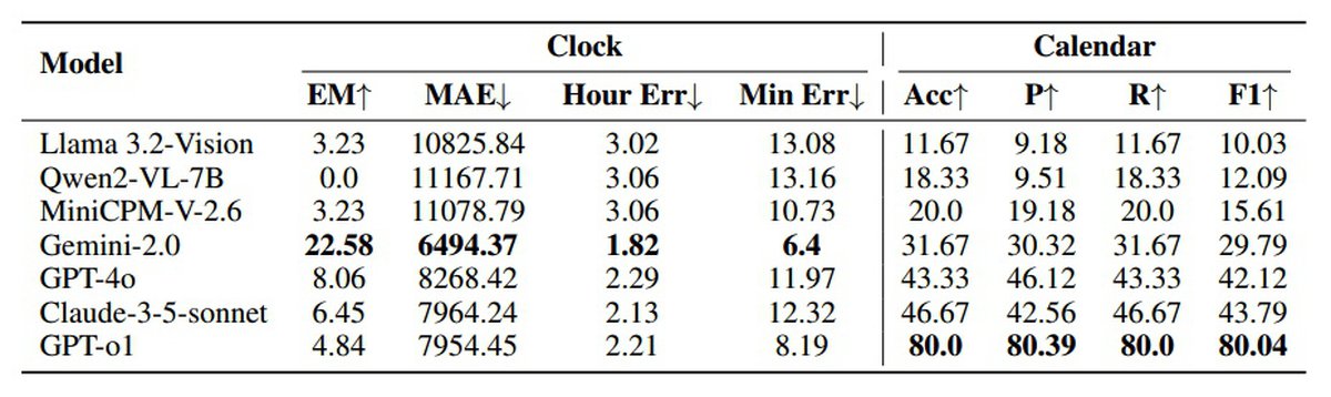 Некоторые модели лучше справлялись с календарями: например, o1 от OpenAI правильно ответила на 80% вопросов про календари, но в задаче с часами дала лишь 4.84% правильных ответов.