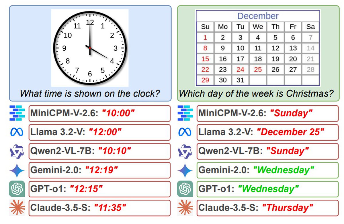 Команда ученых из Эдинбургского университета скормила изображения часов и календарей Gemini 2.0, o1, GPT-4o, Claude 3.5 Sonnet, Llama 3.2 и некоторым другим моделям. Затем нейросетям задавали вопросы, связанные с этими изображениями.