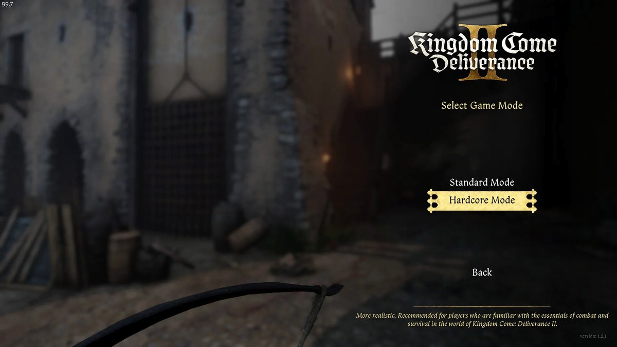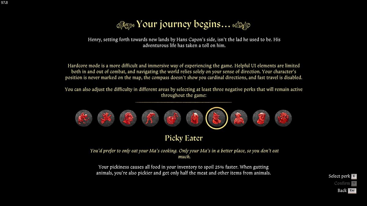 Как и в первой части Kingdom Come Deliverance, хардкорный режим предлагает выбрать набор негативных перков, усложняющих прохождение. В нынешней версии игры реализовано десять таких перков, нужно выбрать как минимум три.