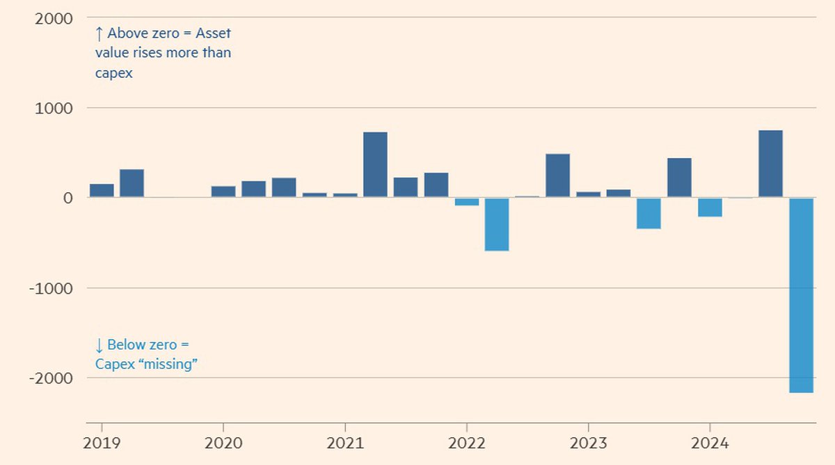 Сперва журналисты сравнили оценку активов Tesla с капитальными затратами в первом полугодии 2024 года — выяснилось, что разница между показателями равна $1.4 миллиарда. Это необычно: как правило, если компания наращивает капитальные затраты, то стоимость ее активов растет.