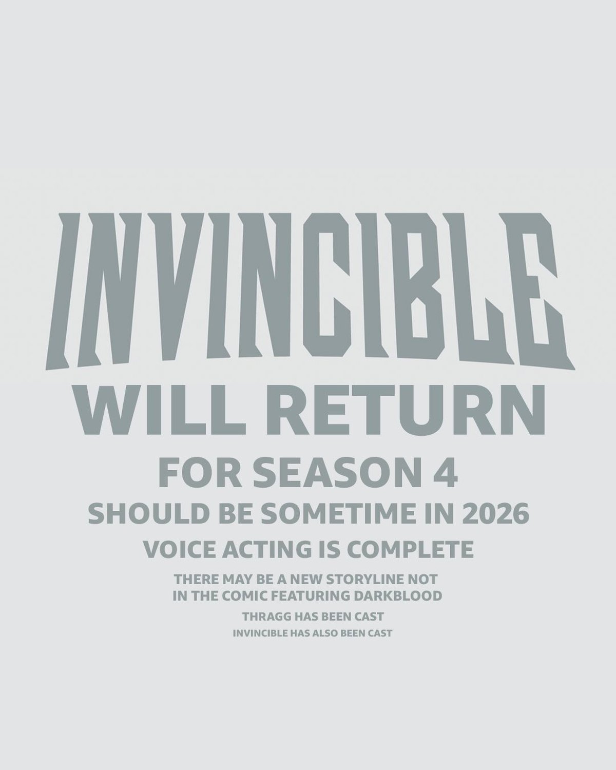 Продолжение анимационного сериала Invincible все-таки выйдет в 2026 году. Сперва о переходе шоу на ежегодный формат рассказал создатель оригинальных комиксов Роберт Киркман, теперь премьеру в 2026 году подтвердил аккаунт Invincible в X/Twitter.