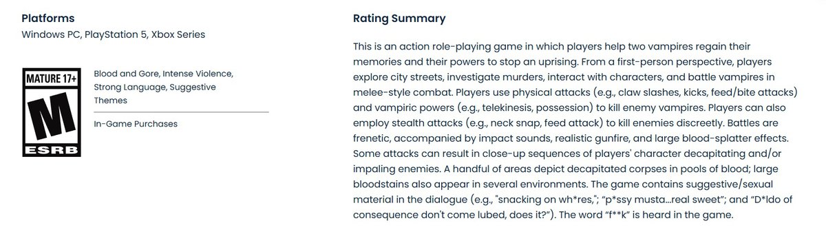 Рейтинговое агентство ESRB выдало ролевому экшену Vampire The Masquerade Bloodlines 2 возрастной рейтинг M. Вместе с рейтингом агентство распространило описание игры, раскрывающее кое-какие новые детали.