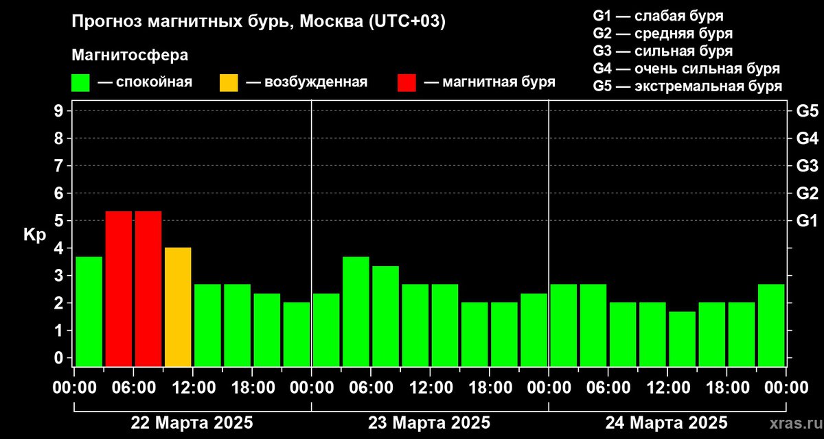 Ведомство ожидает, что уже 23 марта магнитная буря повторится, причем ее сила достигнет класса G3 — то есть буря будет мощной. В последние месяцы бури такого класса не наблюдались, мы видели максимум бури класса G2.