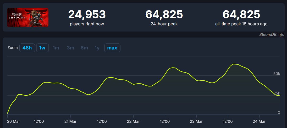 Согласно данным Ubisoft, на старте Assassin's Creed Shadows привлекает аудиторию быстрее Assassin's Creed Origins и Assassin's Creed Odyssey, но медленнее Valhalla, самой быстро продаваемой игры серии. К сожалению, достоверно сравнить аудитории этих игр в Steam невозможно: они выходили в магазине с большой задержкой.